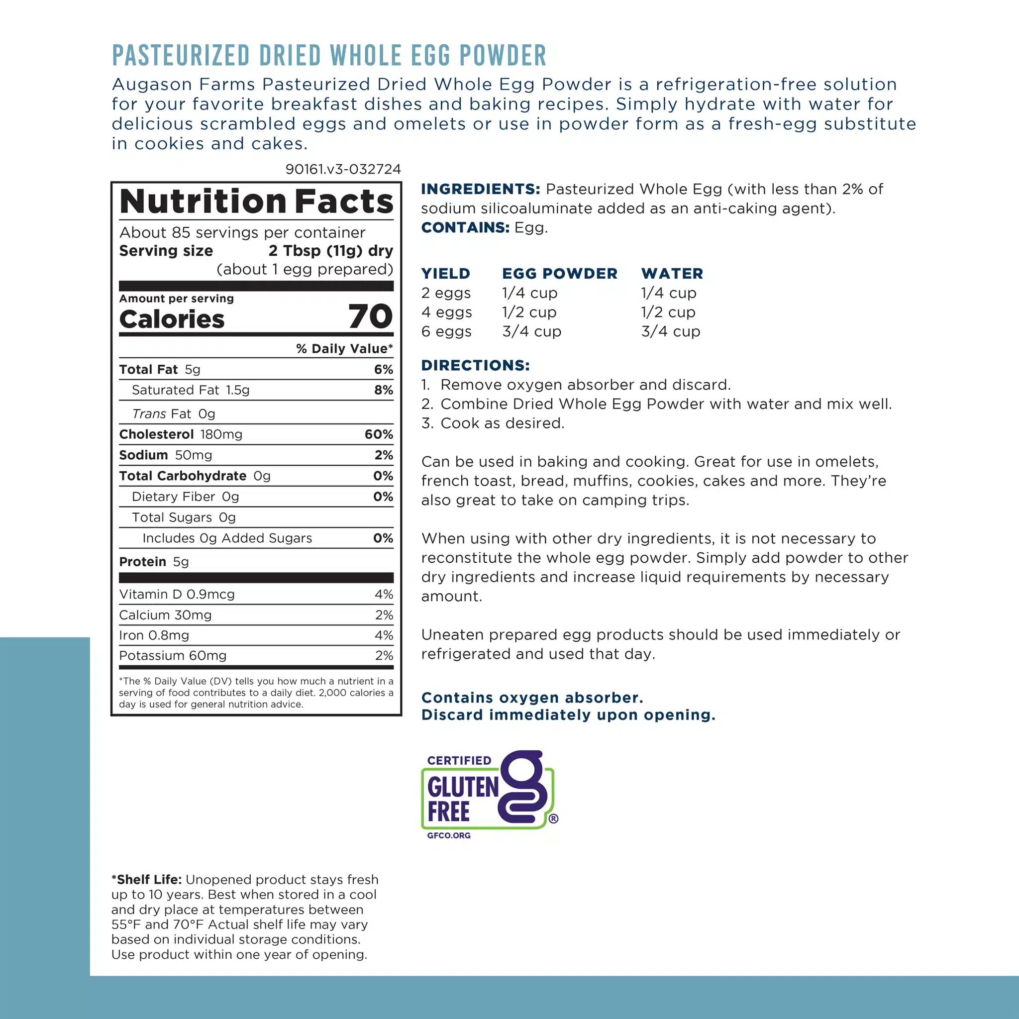 Augason Farms Whole Egg Powder is a refrigeration-free solution for your favorite breakfast dishes and baking recipes. Made from 100% natural egg whites and yolks, Augason Farms powdered eggs are ideal for baking and cooking. Hydrate with water for scrambled eggs and omelets or use the powder form for a refrigeration-free substitute in baking recipes.