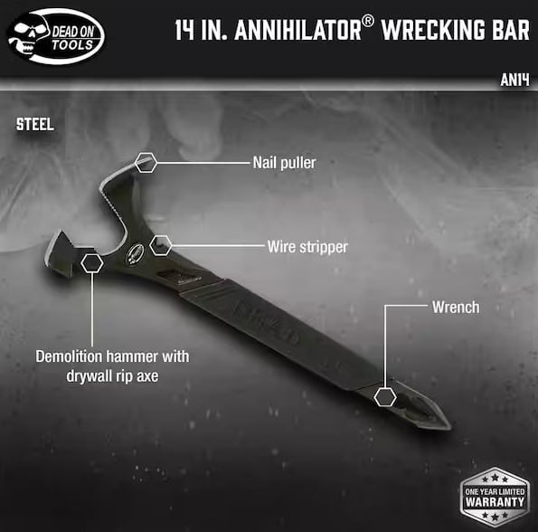 The Dead On Tools Annihilator – 14 boasts a demolition hammer, axe, wrench, chisel, and even a bottle opener, this tool does it all. The AN14 has a smooth hammer face and an overall length of 14 in.