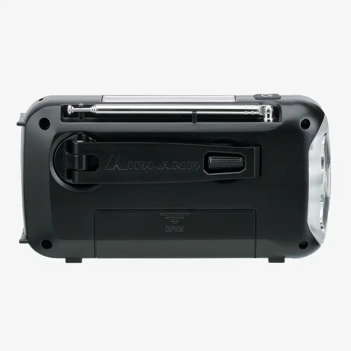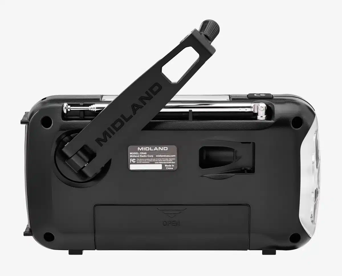 The Midland ER40 Portable Emergency Weather Alert Crank Radio features a 2600 mAh li-ion 18650 rechargeable battery, multiple charge methods, an LED flashlight and strobe, NOAA, AM/FM and weather alerts and can be used as a portable power bank.