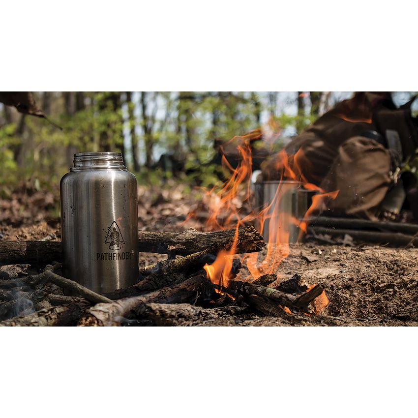 The Pathfinder Gen 3 Wide Mouth Water Bottle is a 32 oz single wall container made from 304 food grade stainless steel and can be placed directly in fire/coals.