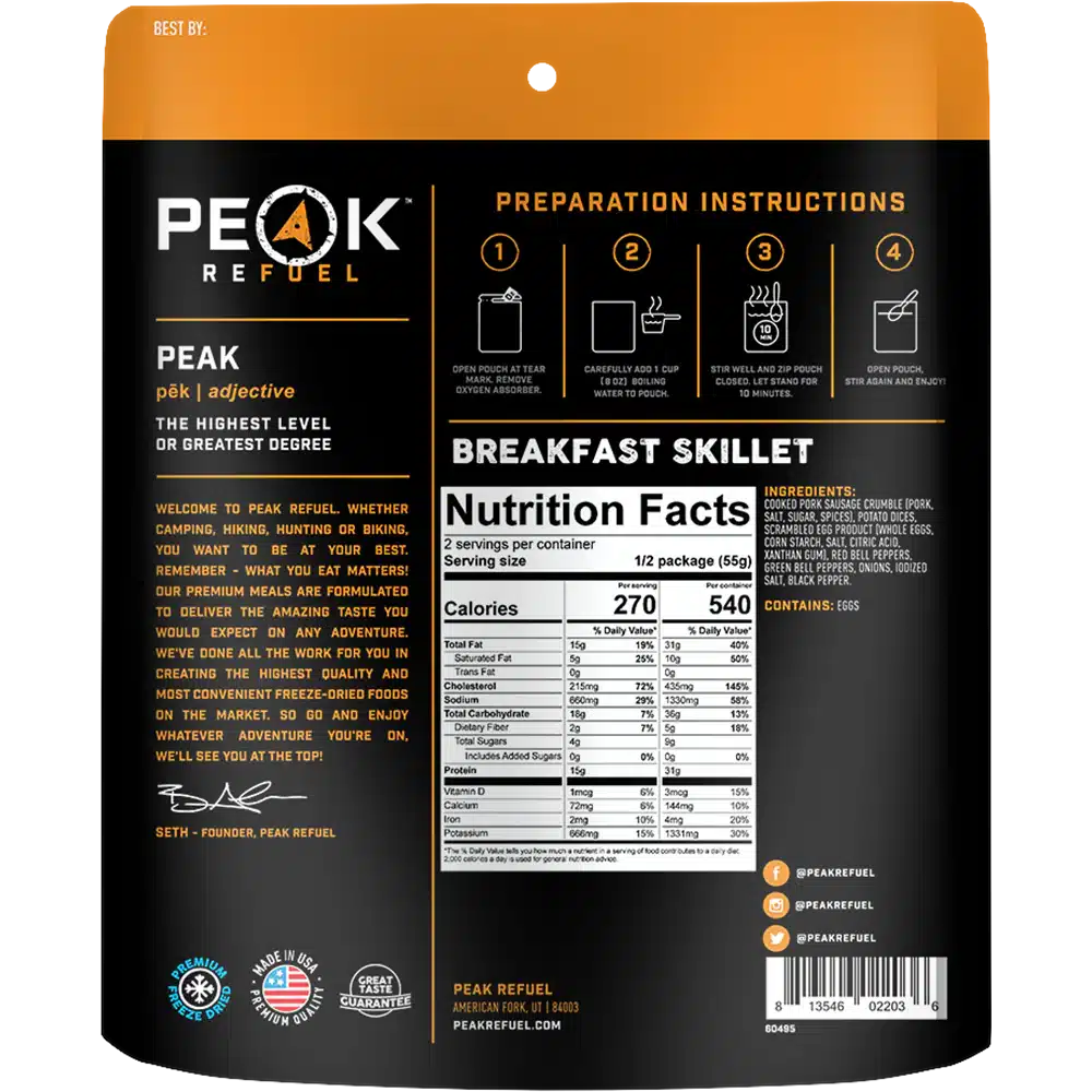 Peak Refuel Breakfast Skillet is a high protein meal with premium ingredients. Eggs, Sausage, Potatoes & Peppers. Quick to prepare and easy to enjoy, it’s the ultimate comfort food for those who crave both flavor and nutrition. Because it cooks in the pouch, it’s a great meal for camping, hunting trip or your go bag!