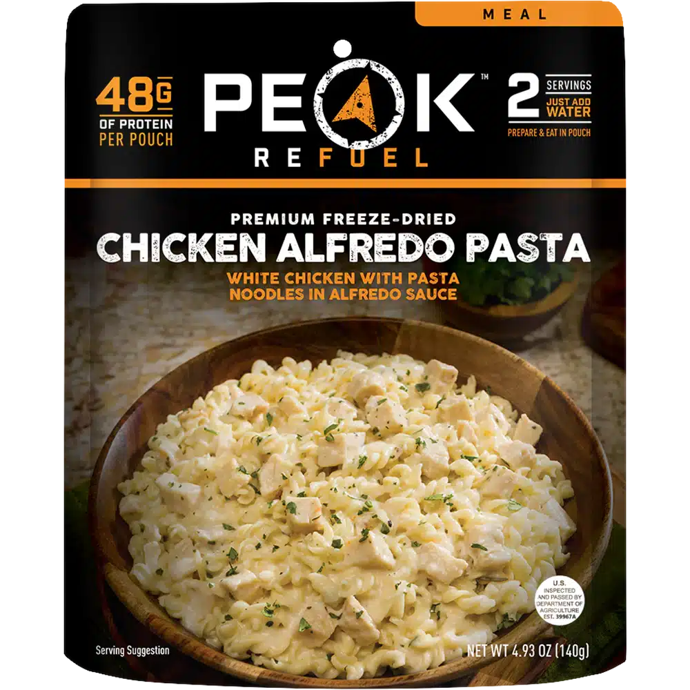 Peak Refuel Chicken Alfredo is packed with 48 grams of protein using real chicken breast, creamy cheeses, and a craft-style alfredo sauce. And because the ingredients are freeze-dried in one of the best facilities in the USA, the Chicken Alfredo Pasta is mush-free, so you can recharge with whole ingredients that hit the spot.