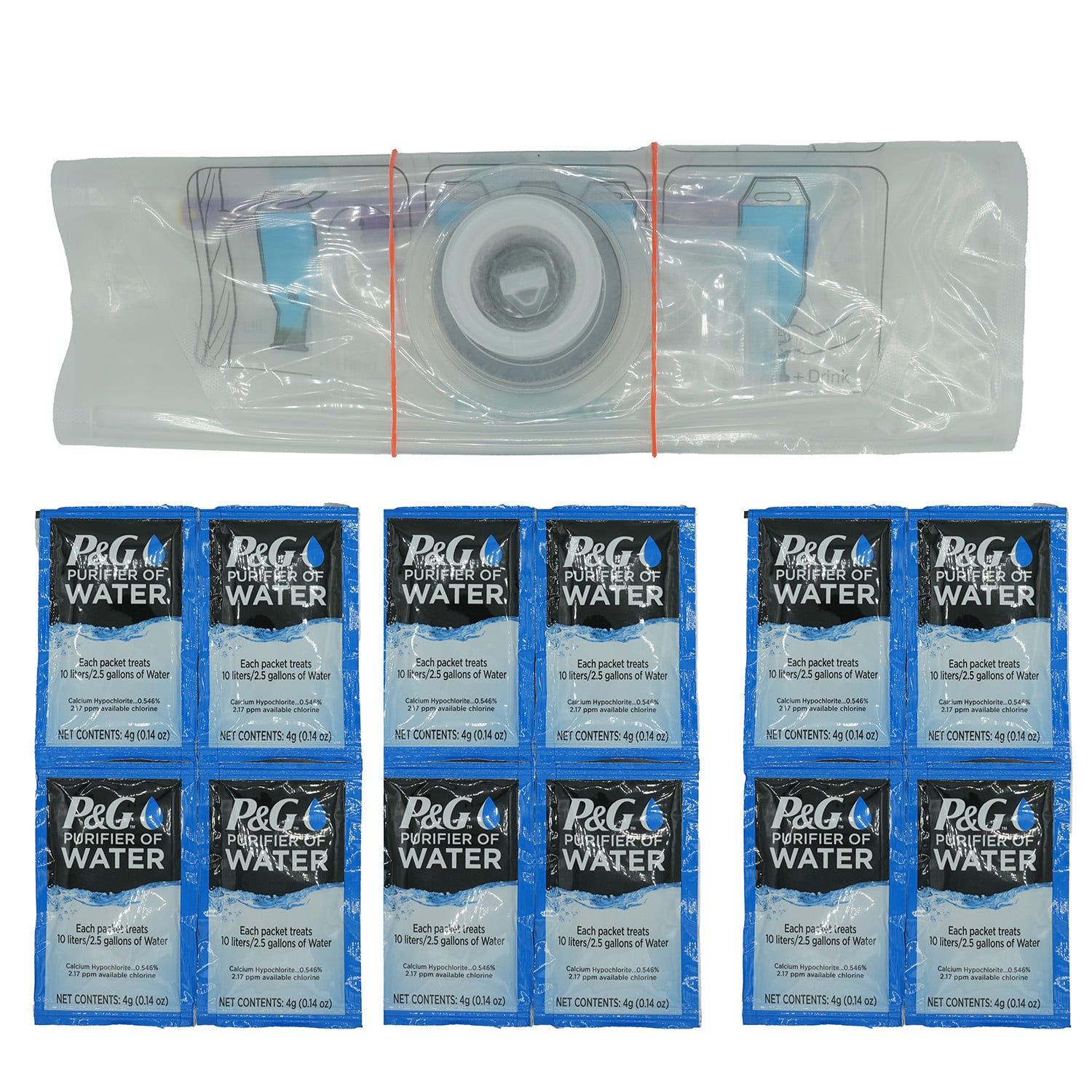 - 12 packets of P&G Purifier of water; Each packet treats 10 liters of water.