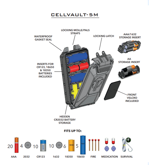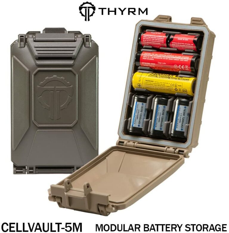 The THYRM CellVault-5M is a robust modular battery storage solution, providing a safe haven for the batteries you rely on the most. Protect those high-drain cells that power your critical flashlights and gear. Whether you need AAs or CR123s for a helmet light or NVGs, 18350s for your pistol, 18650s for your rifle, or AAAs for your electronic ear protection, the CellVault-5M can be configured to carry exactly what you need. It keeps cells safe, dry, and attached to your gear. Always be ready for that critical reload away from base.