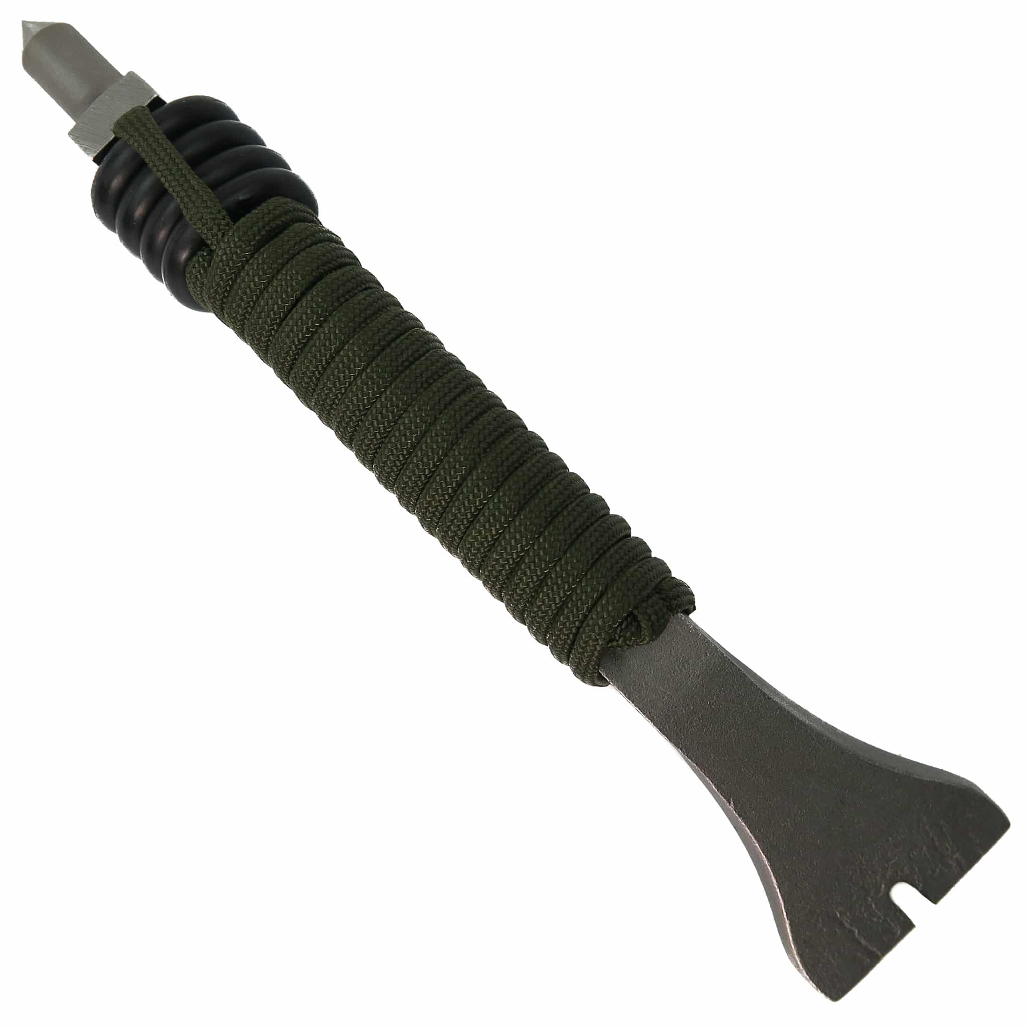 The TOPS Pry-Probe-Punch Tool is a multi-purpose emergency tool. Wrapped in green paracord, the tool is forged 5140 and properly heat treated for optimal function as a pry bar. The punch tip can be re-sharpened with a file if repeated strikes of tempered glass dull the point.