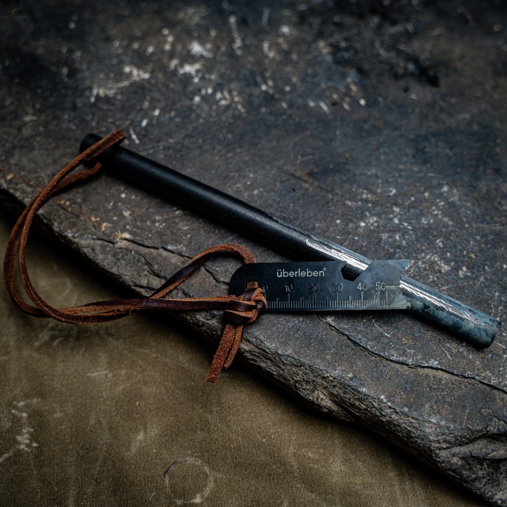 The Uberleben Kräftig 5″ Fire Starter is the original wilderness workhorse. The Kräftig includes half-inch thick, Sånft-korr™ ferrocerium rod made in Austria. It also includes a leather lanyard, and a 6-function multi-tool striker.