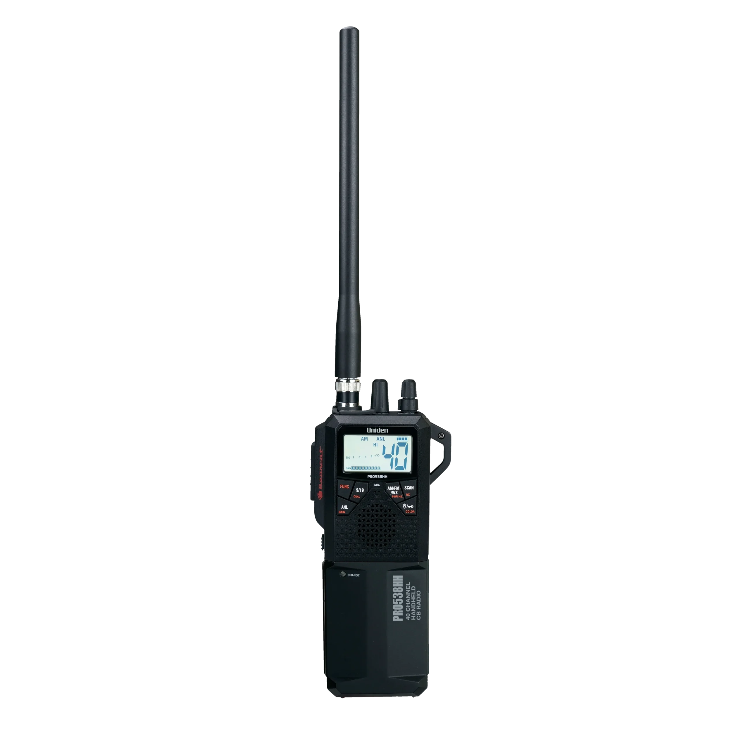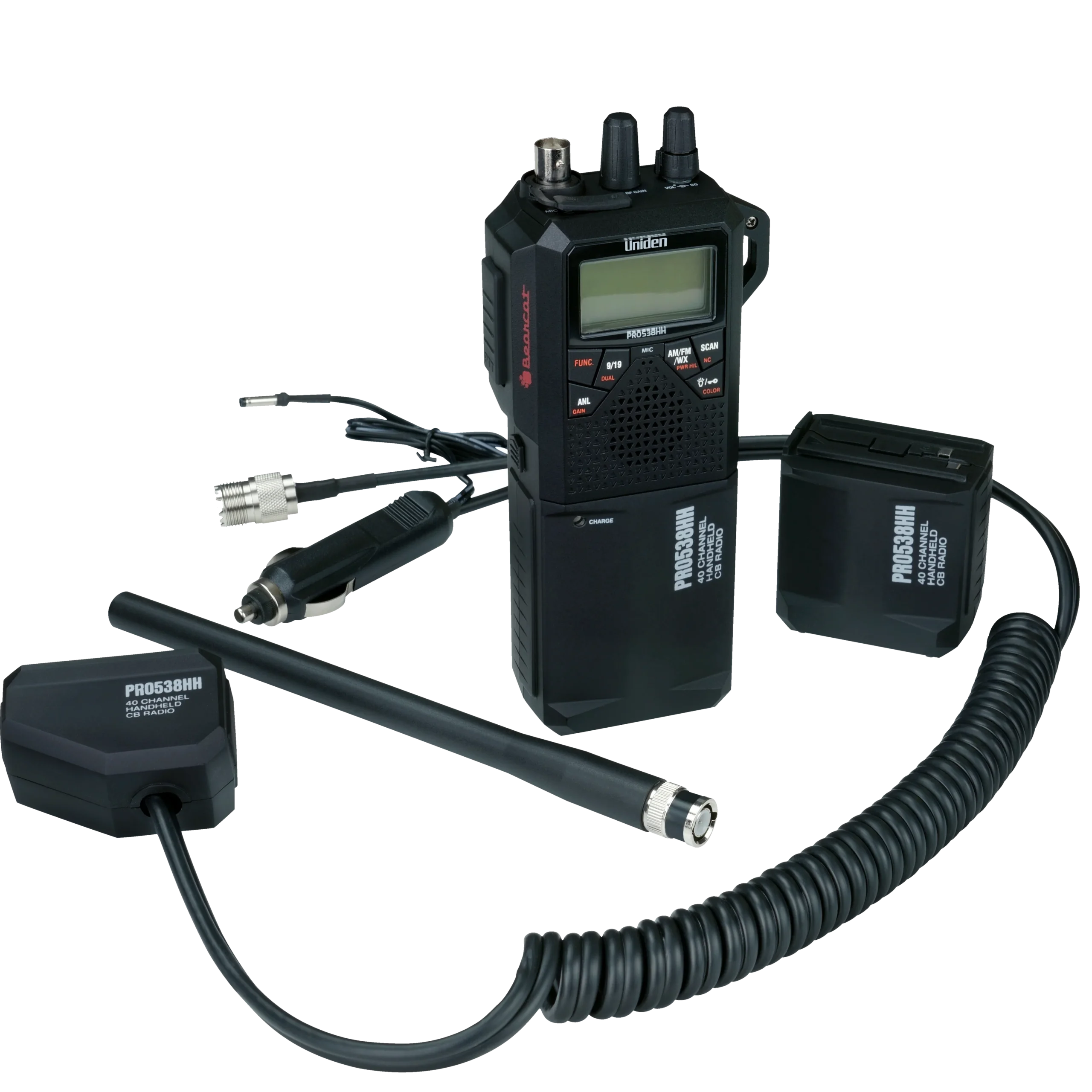 The Uniden PRO538HHFM is a full-featured convertible handheld/vehicle 40 channel CB radio with FM mode and NOAA Weather, 12v adapter and high/low power settings.